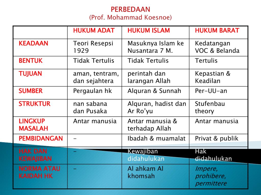 | Sumber Hukum | Al-Quran dan Hadits | Undang-undang dan preseden hukum |